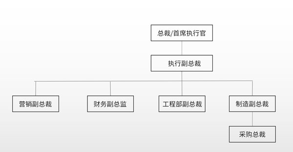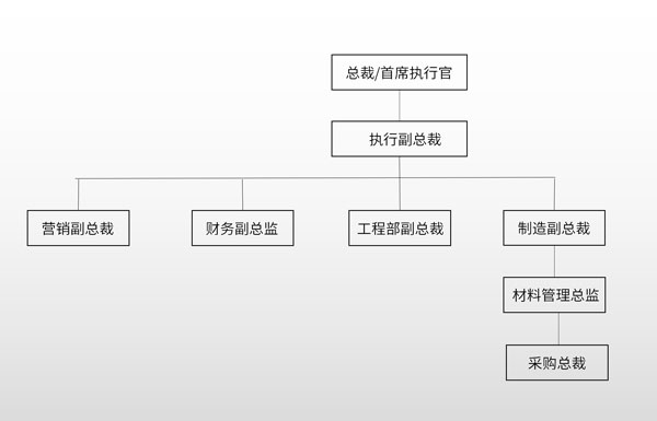 在(c)中,采购是一个较低级别的功能,执行总裁有两个报告级别。